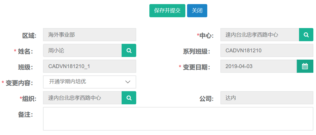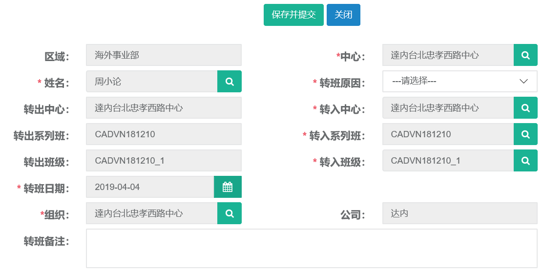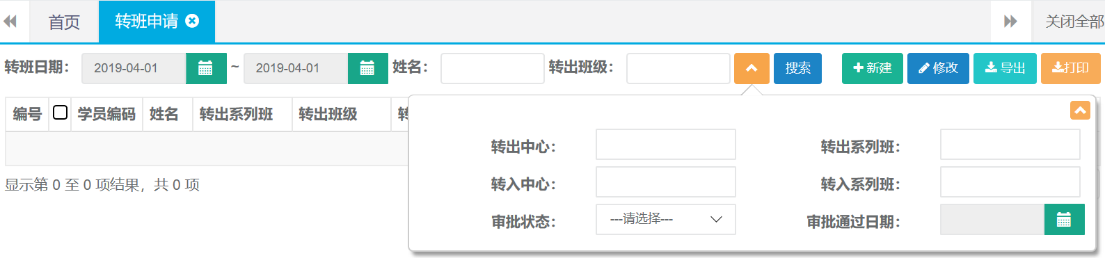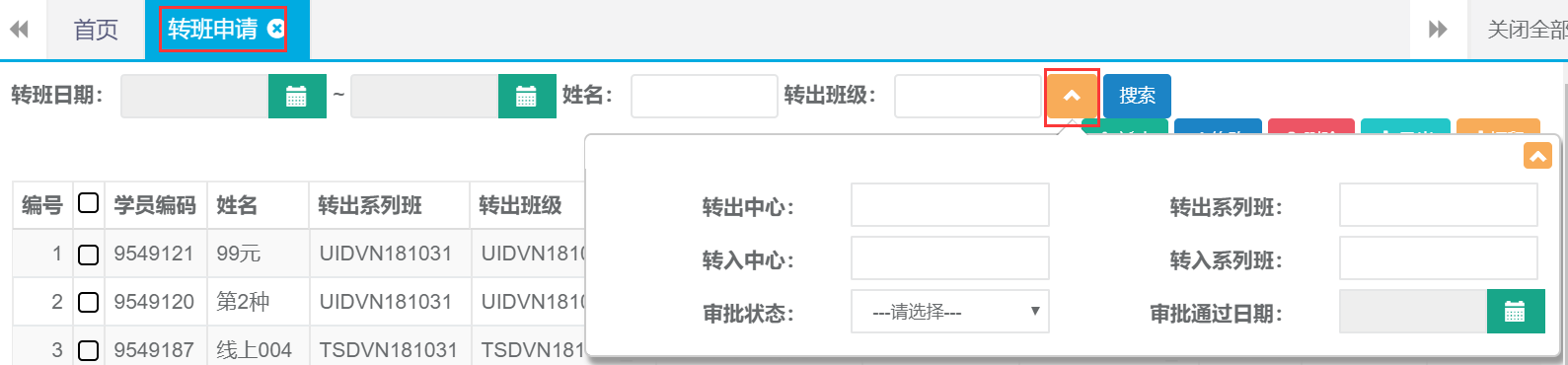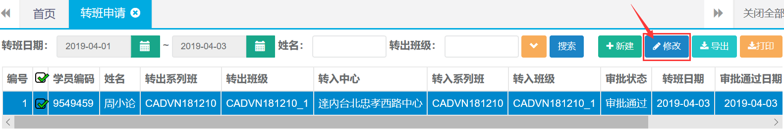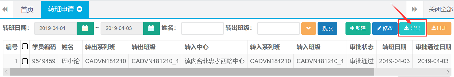 当线下邮件审批流程结束后,在CRM管理系统中选学员异动,进入转班申请,新建一个申请后,选择跨中心转班类型,选择学员需要转入的班级即可