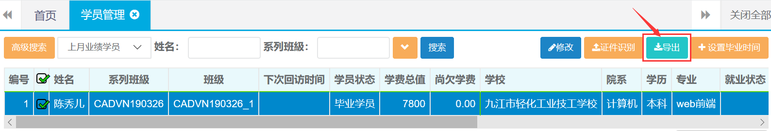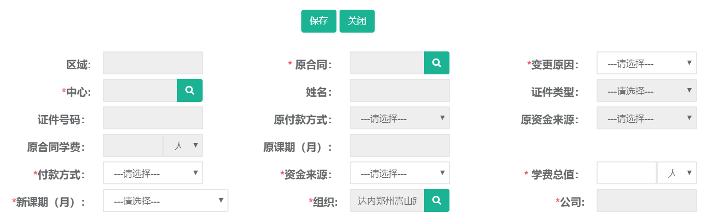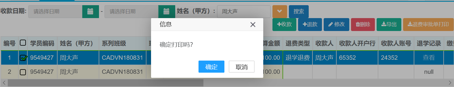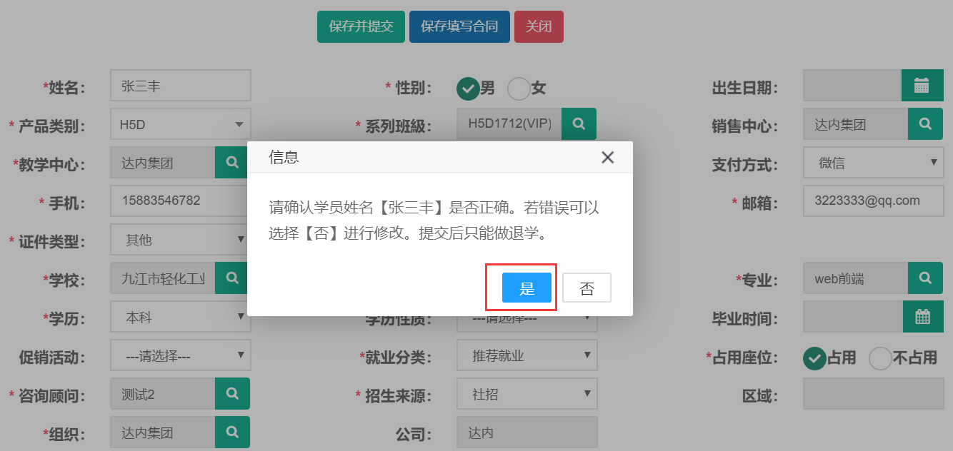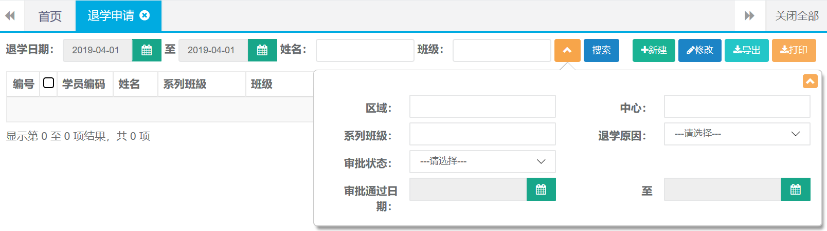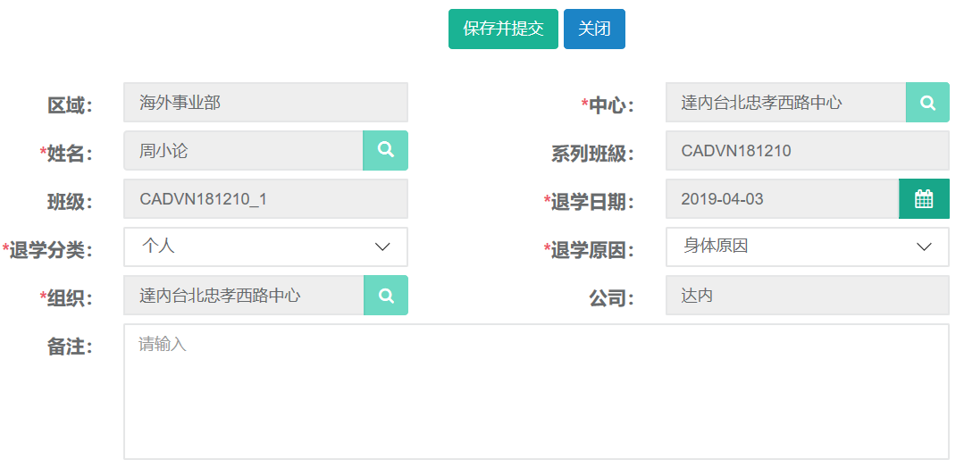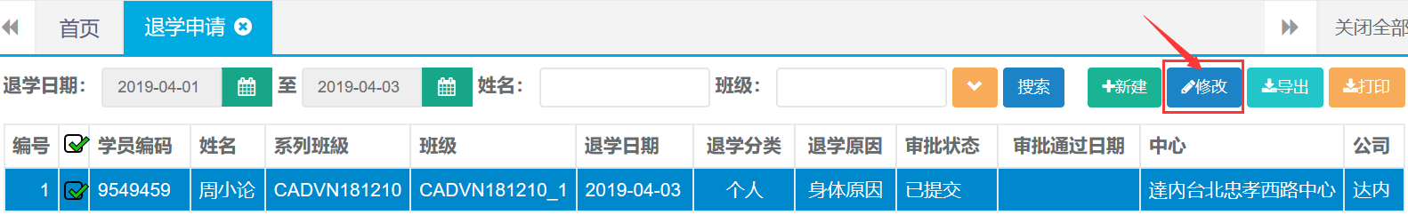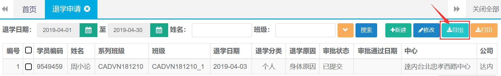 系统提交退班申请。在CRM系统“教学管理-学员管理-双击学员详情-退学页签-退学按钮”操作。 |