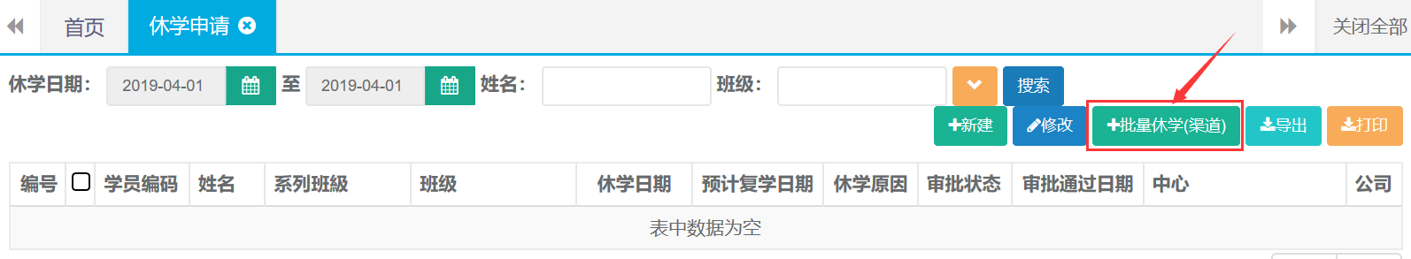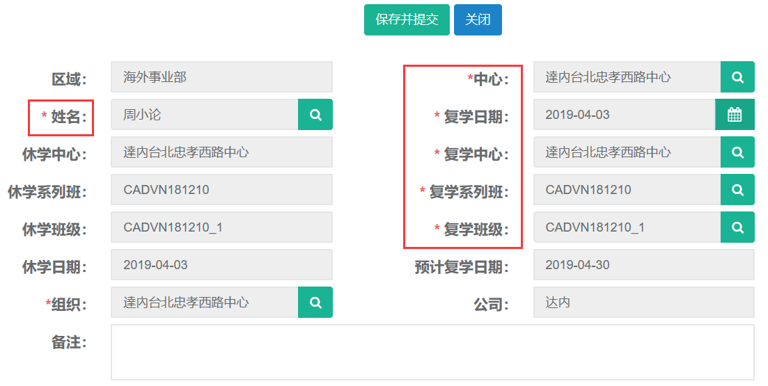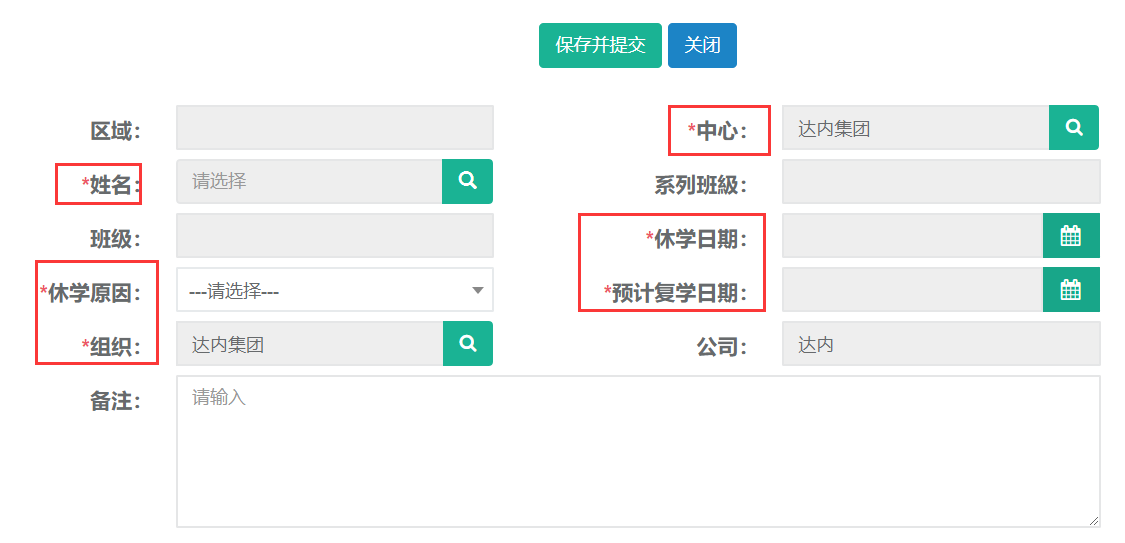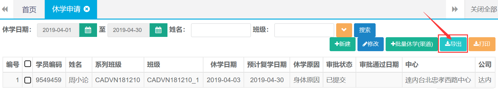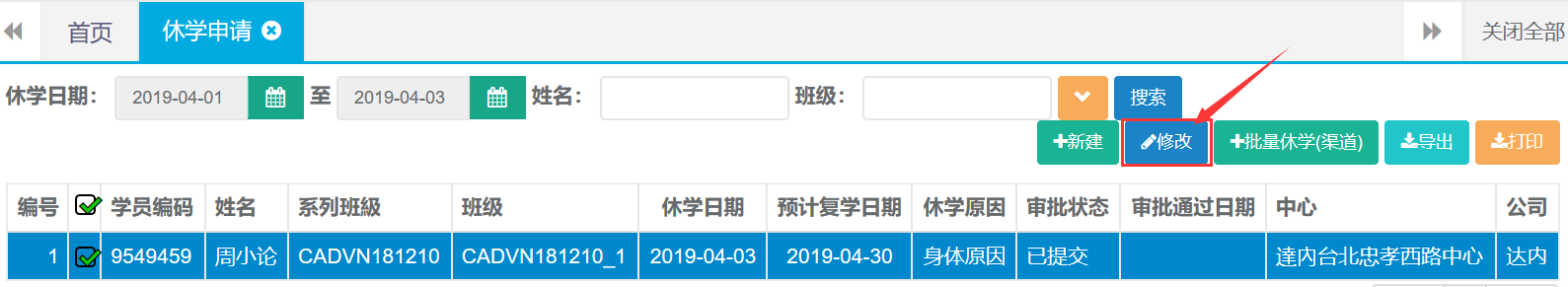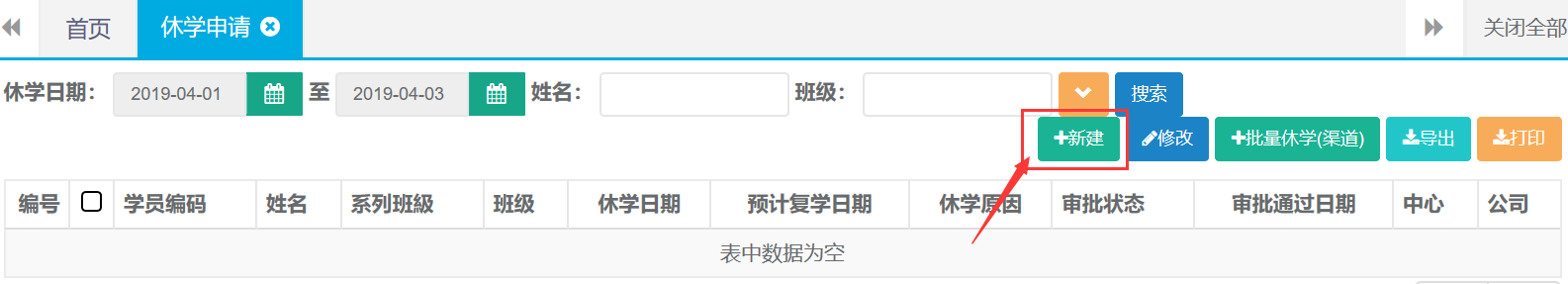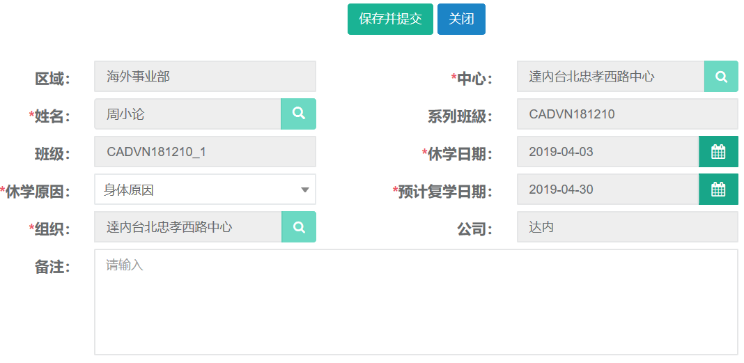 a) 在CRM管理系统中选学员异动,进入休学申请模块,新建一个申请后,在系统中填写休学原因及复学的日期